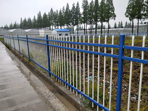 現(xiàn)貨藍(lán)白色三橫桿鋅鋼管護(hù)欄網(wǎng)價(jià)格冒雨安裝